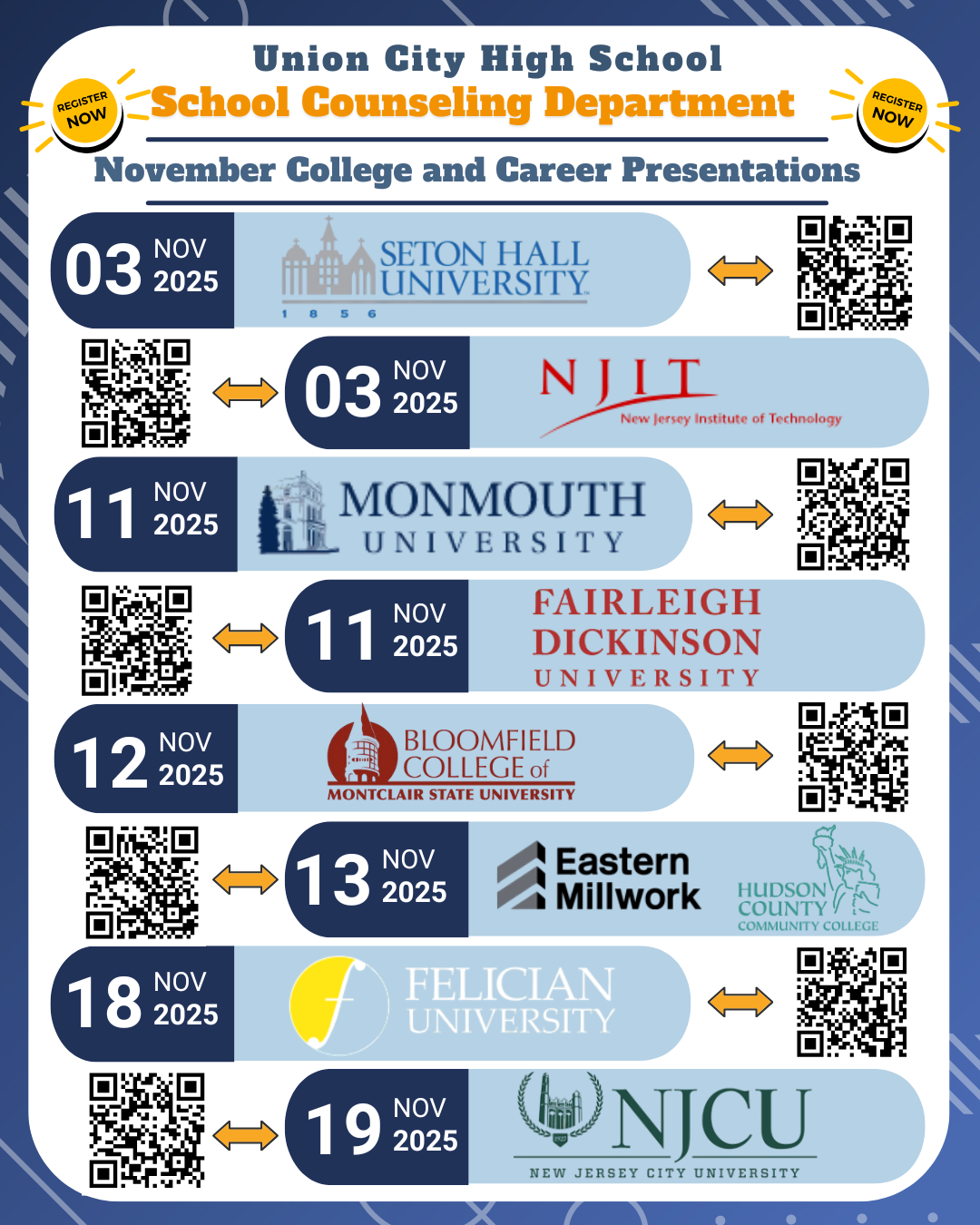 Les informamos sobre las próximas presentaciones sobre universidades y carreras profesionales que se llevarán a cabo en noviembre en la Escuela Secundaria de Union City. Gracias por tomarse el tiempo de revisar toda la información que se proporciona a continuación.