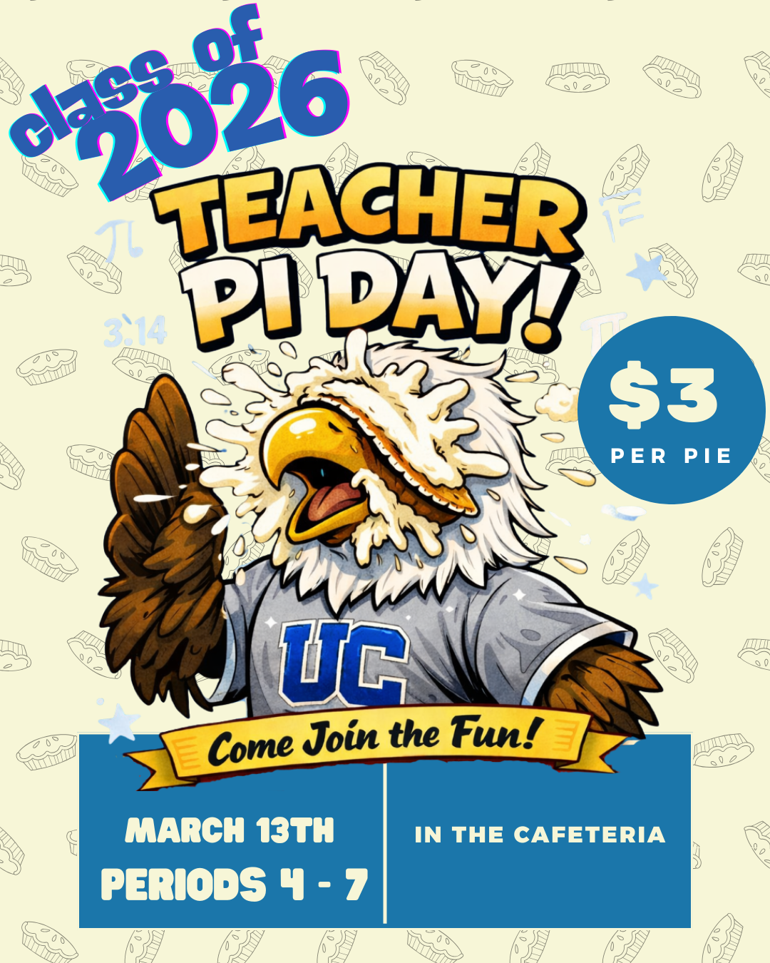 ¡Gracias a todos los profesores y administradores que han aceptado participar en nuestra recaudación de fondos del Día de Pi para profesores! El evento tendrá lugar el 13 de marzo durante todos los periodos de almuerzo en la cafetería.